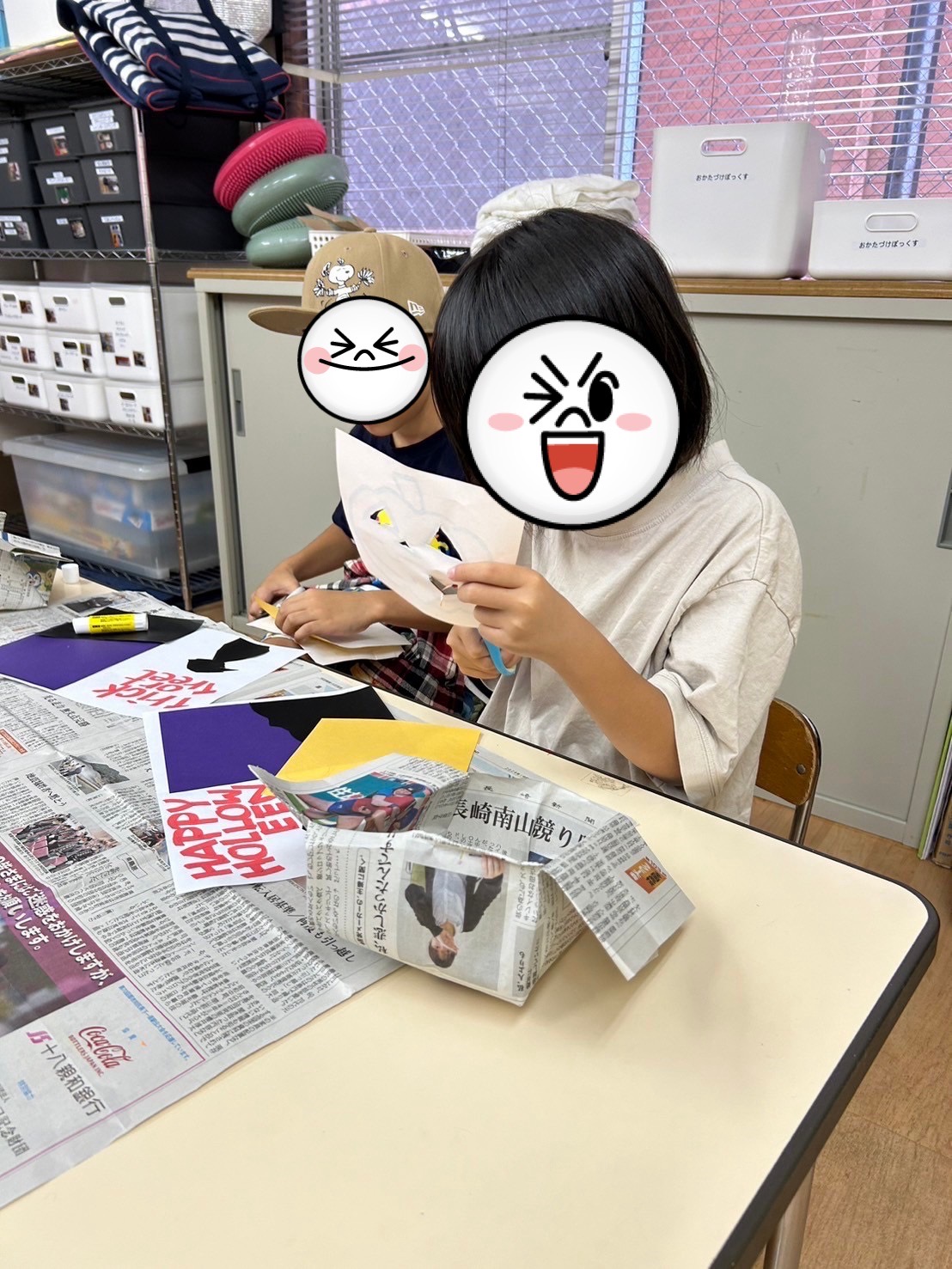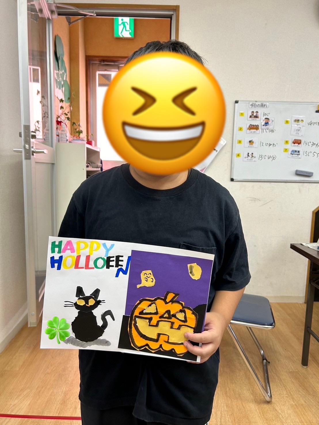 えもじあそびは、折り紙を使ってハロウィンの切り絵とちぎり絵をしました。指先を使う作業なので手先の器用さにつながったり、ハサミ等の道具を使用することでより手元に注意をしながら集中力を身につけることができます