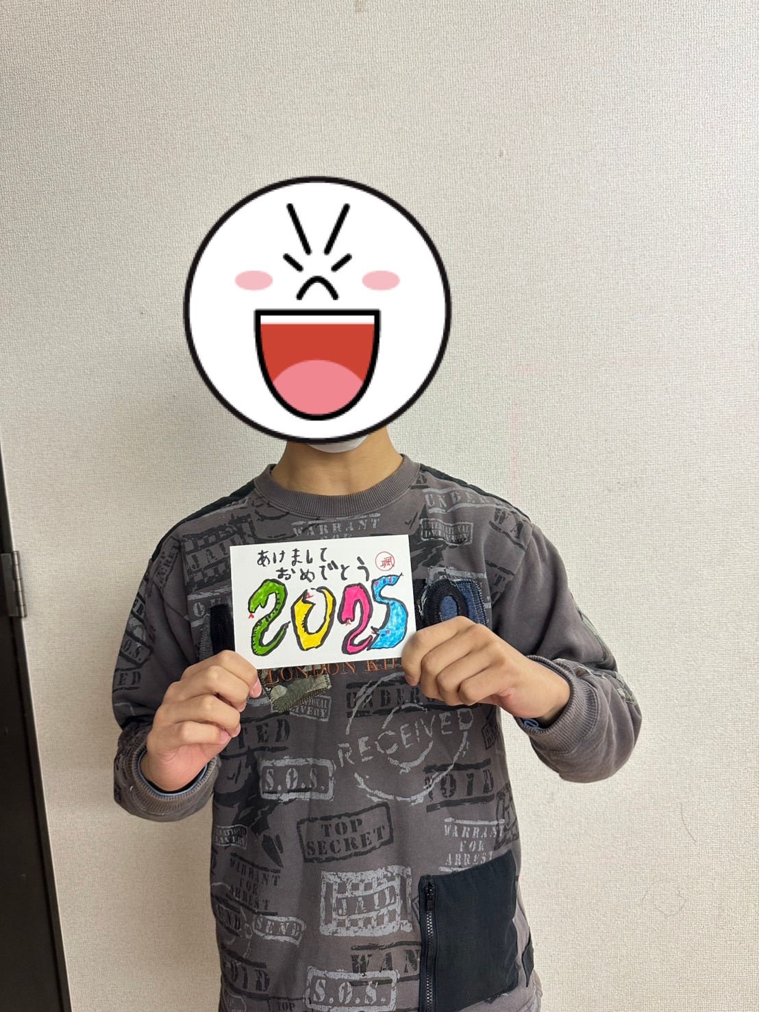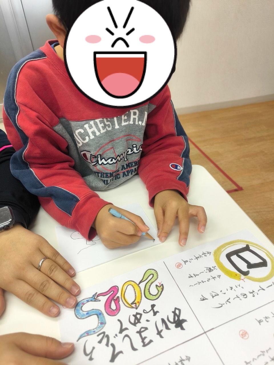 午前中は、えもじあそびをしました🐍今回は前回に引き続き、年賀状書きの本番でした❕子どもたちは、先生が書いたお手本を見ながら丁寧に蛇のイラストや文字を書いていました🌟かっこよくて、可愛い年賀状が完成しました💙