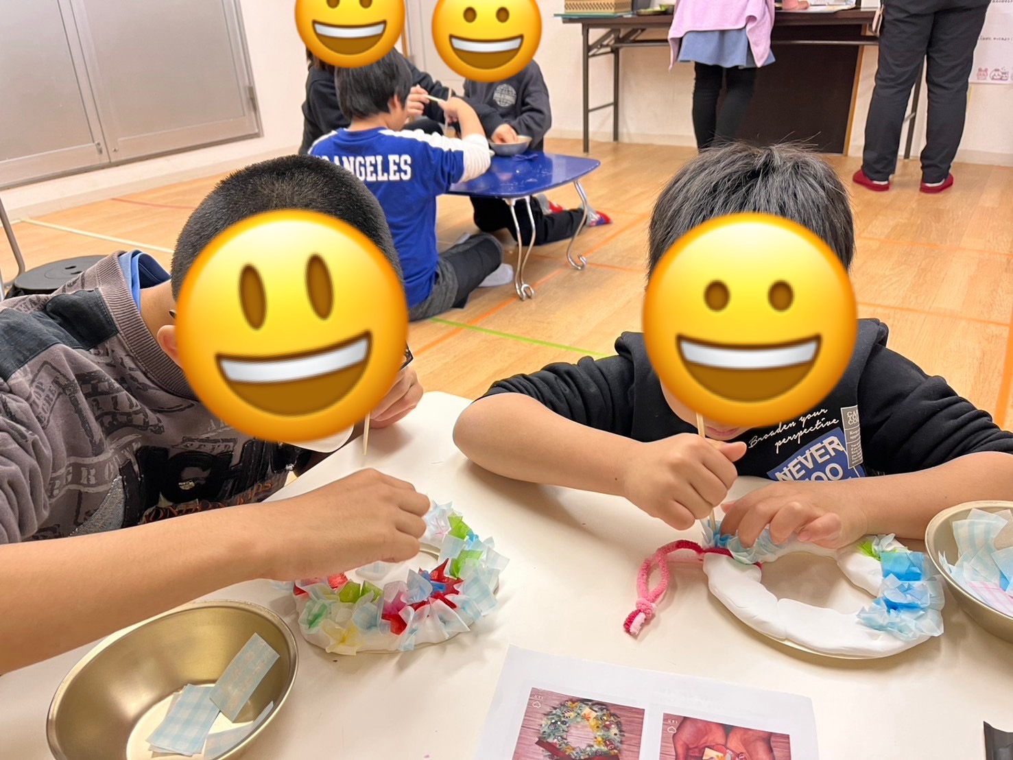 午前中はクリスマス工作にてリース作りをしました🌟紙皿と紙粘土、花紙等を使い、自分たちでデザインを考えて可愛いリースができました💙🎅