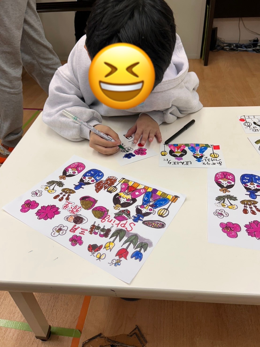 えもじあそびは、3月にちなんでひな祭りのイラストの色塗りや筆ペンで文章を書く練習をしました🎵