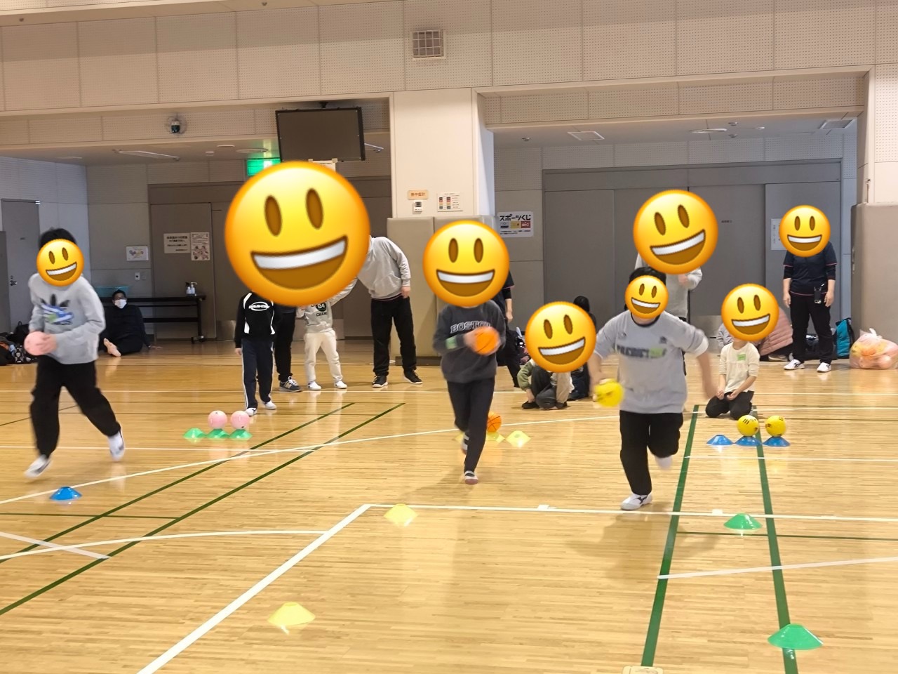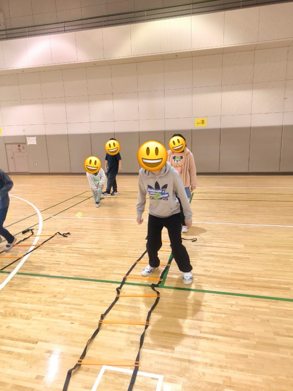ウォーミングアップに鬼ごっこをして身体を温めた後、ラダーを使ってジャンプをしたり、どんじゃんけんぽんやボール運び等をして身体をたくさん動かしました🌟