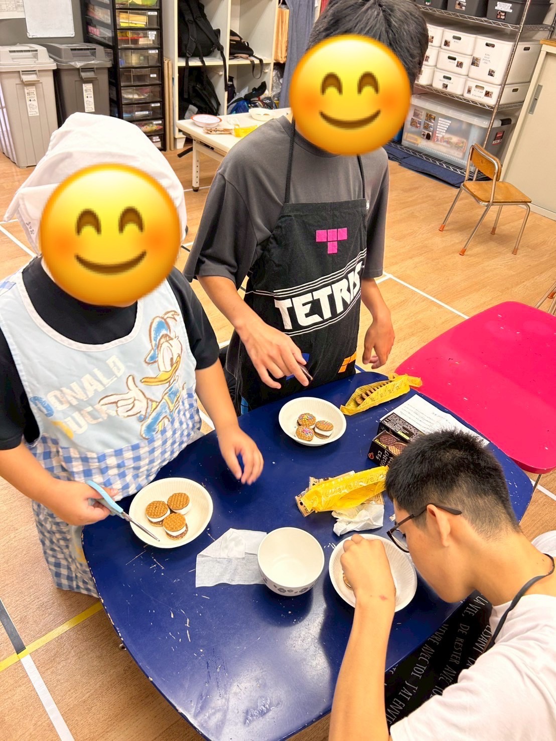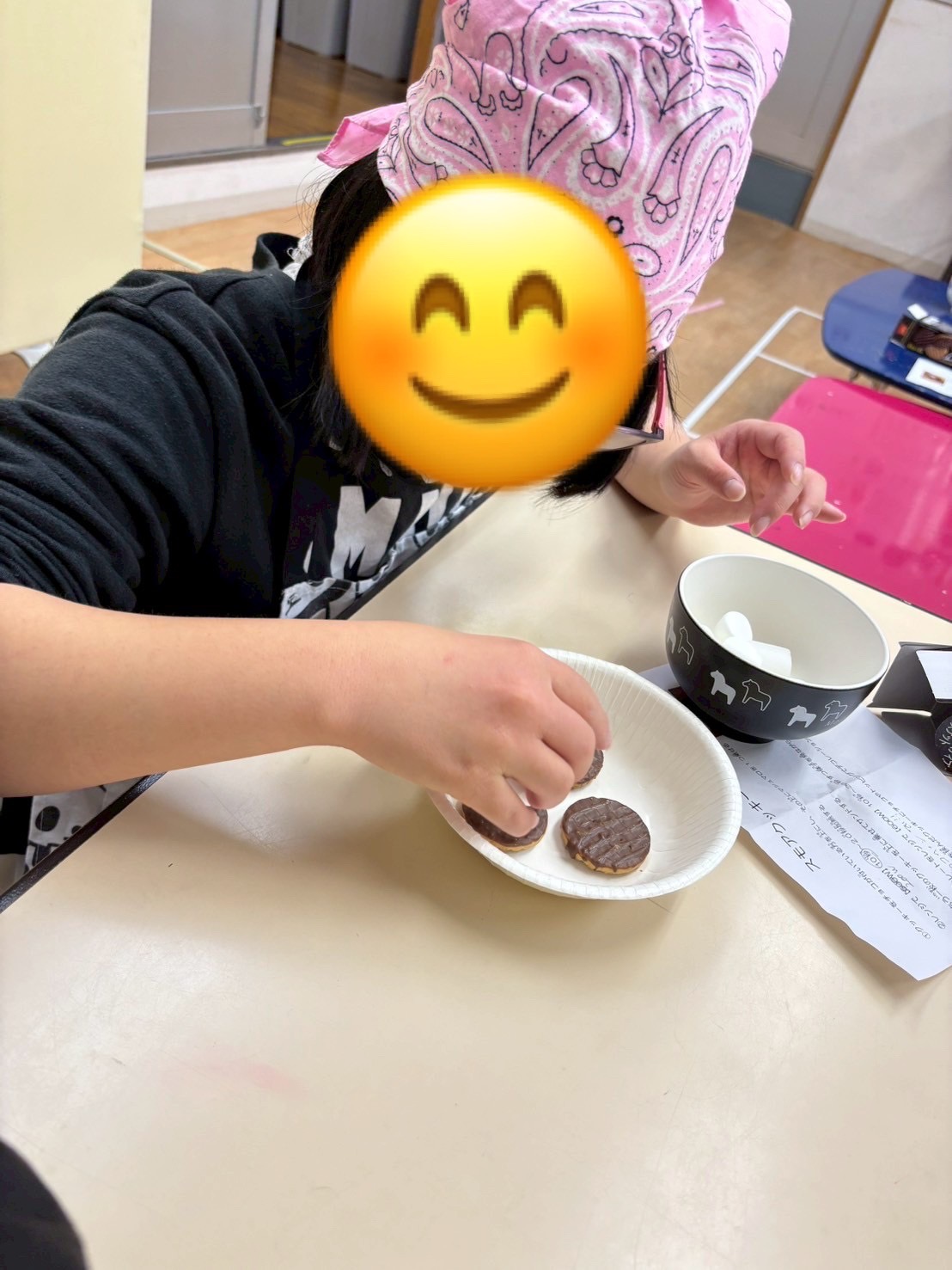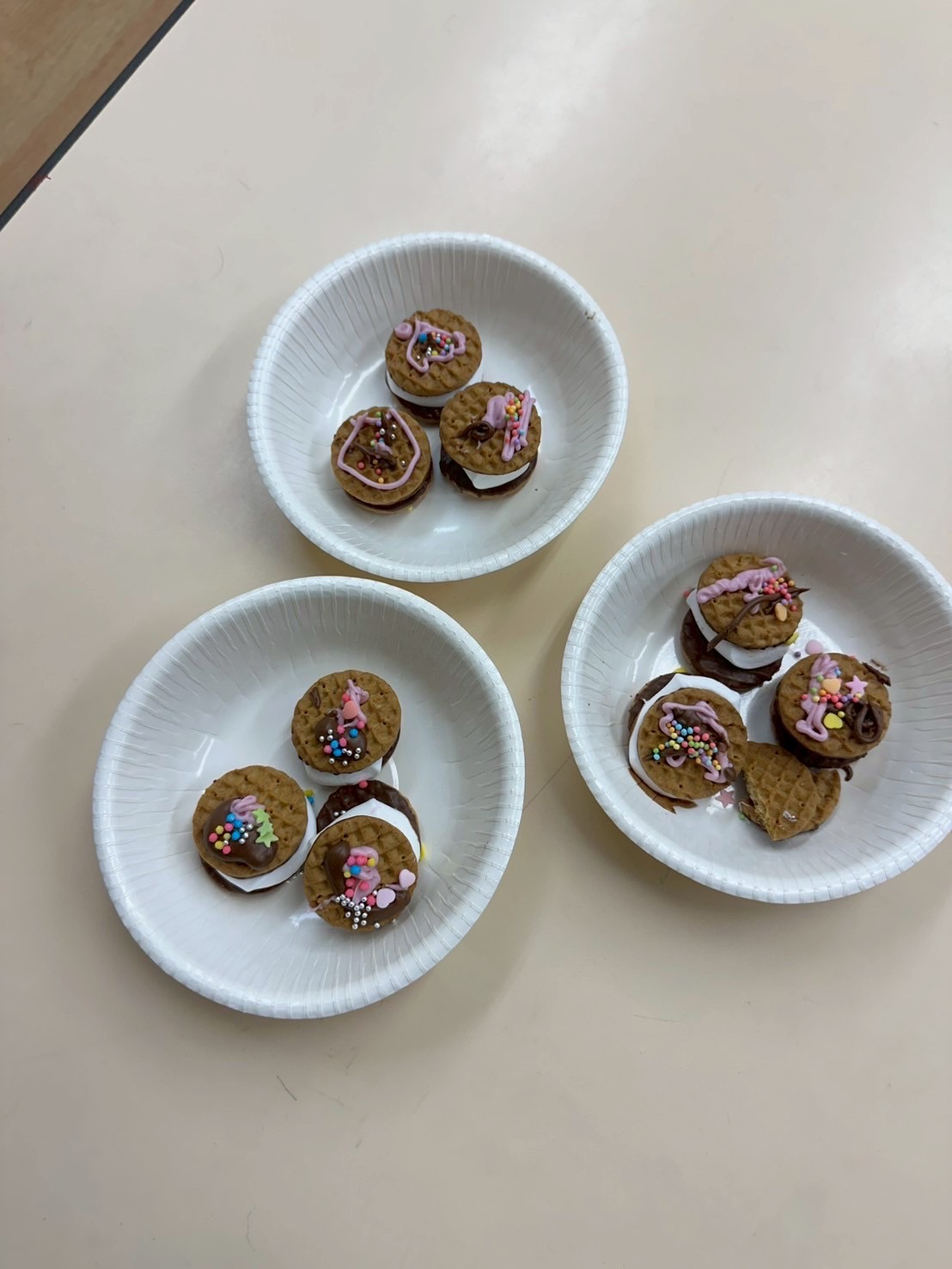 午後のスモア作りをしました🎵チョコクッキーの上にマショマロをのせてレンジで加熱したら、マショマロの上にクッキーをのせて完成💝チョコペンなどでデコレーションもしましたよ☆ミ