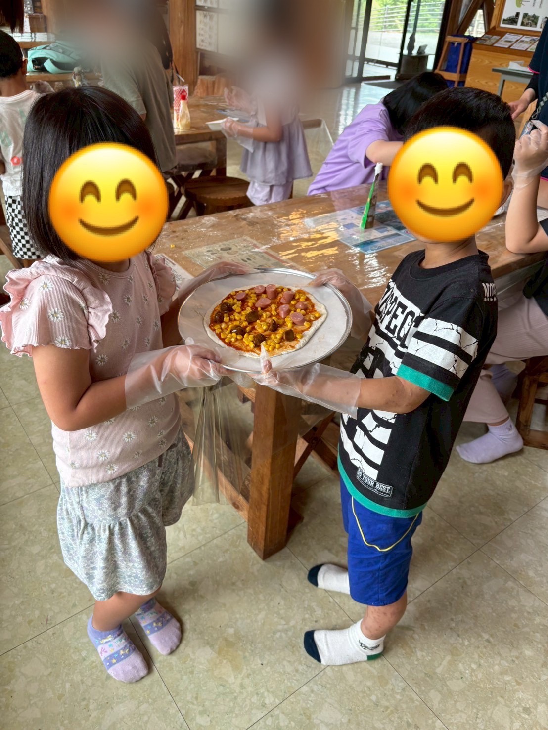 お昼からは、市民の森に行きピザ作り体験をしました。まずは、生地をこねて伸ばし、好きな具材をトッピング!