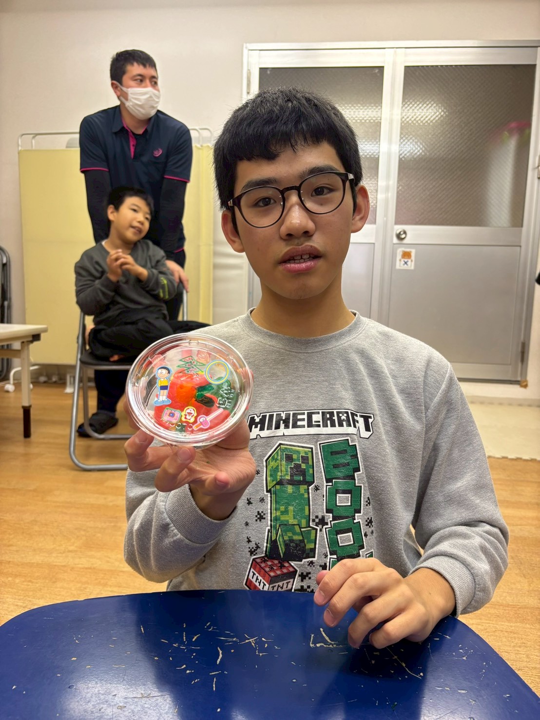 食紅で色をつけ🎨、ゼラチンで固めて作り、さまざまな型の中から好きな形を選んで取り組みました。