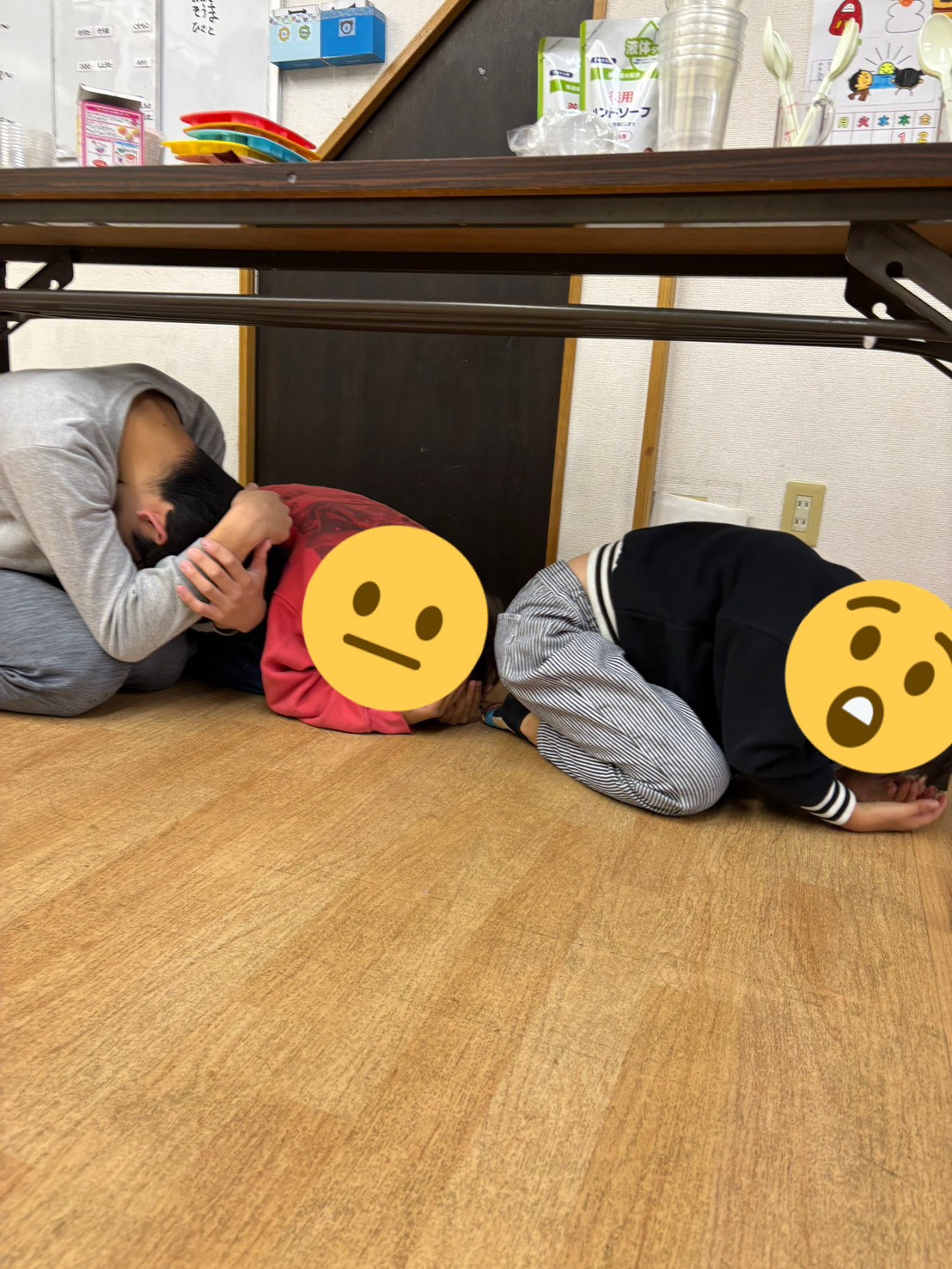 火事などに比べると身近に感じにくい地震ですが、実際に起きた時に落ち着いて行動できるよう、机の下に避難したり🪑、駐車場へ移動する訓練を行いました。