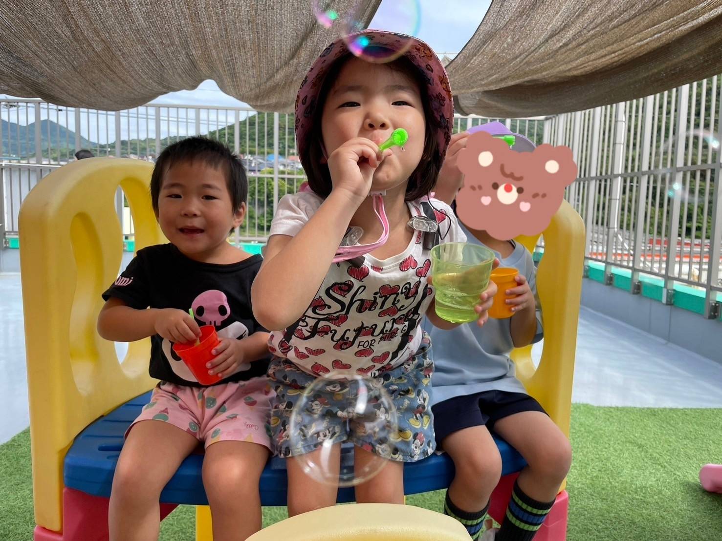 青空の下、きらきらと輝くシャボン玉はみんなの興味をそそりますね✨