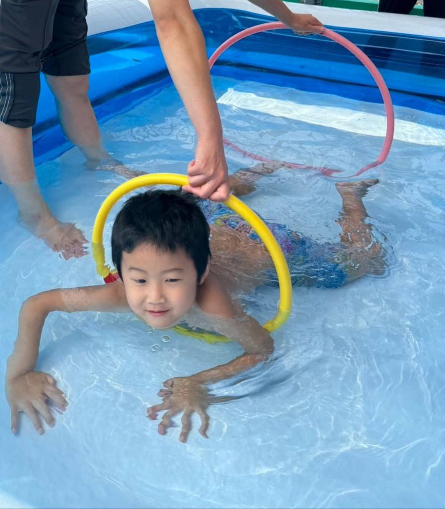 プールを使いながら色んな体の動きを取り入れて遊んでいます♪