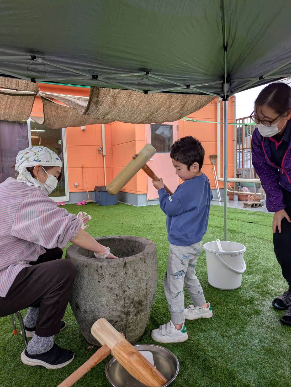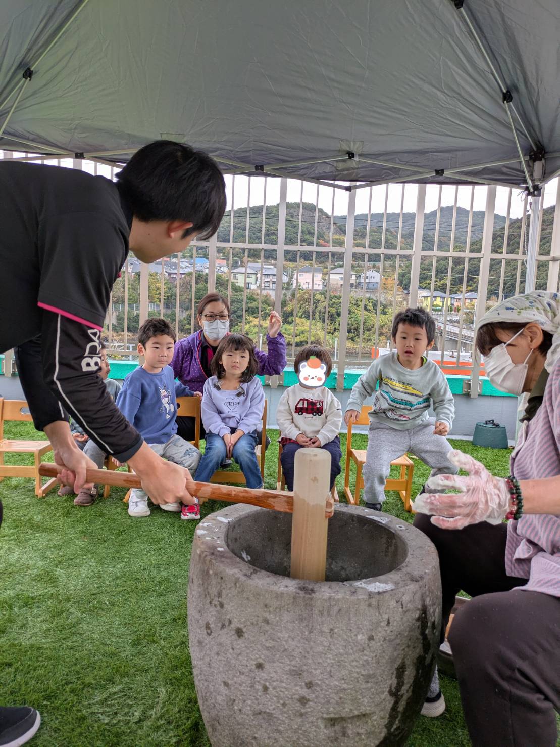 石臼と杵は見たことがあっても使ったことはないというお子さんもいましたが、お餅をぺったん!とつく感覚を楽しんでいました♪