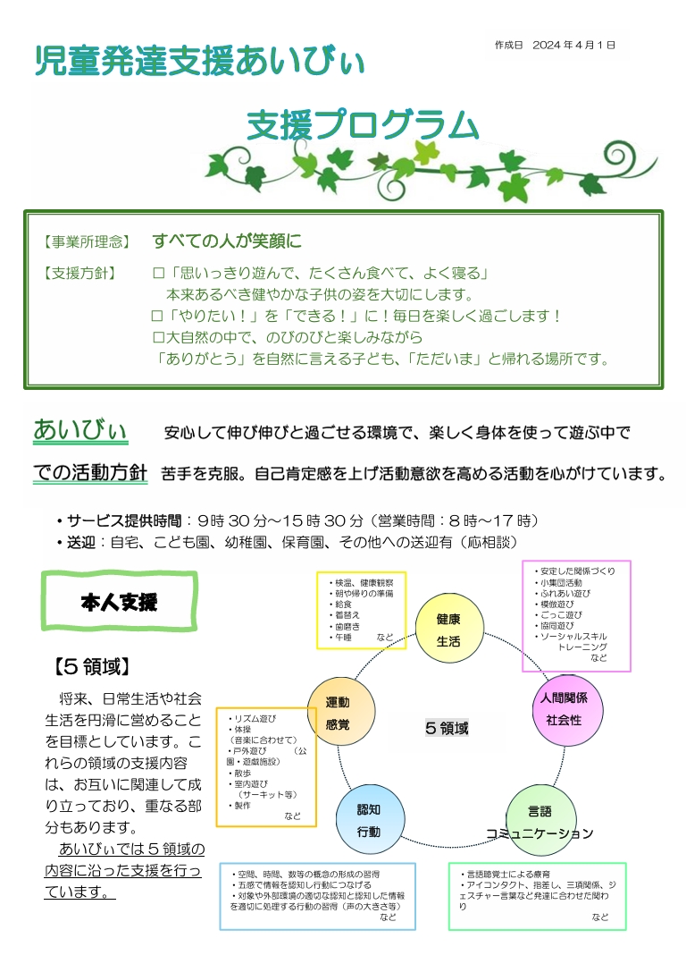お知らせ 一覧に戻る 2025年01月07日【児童発達支援あいびぃ】支援プログラム公表 児童発達支援あいびぃの支援プログラムになります! PDFにすべて載せております。 (あいびぃプログラム★.pdf / 558 KB)