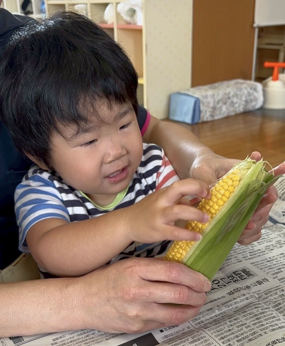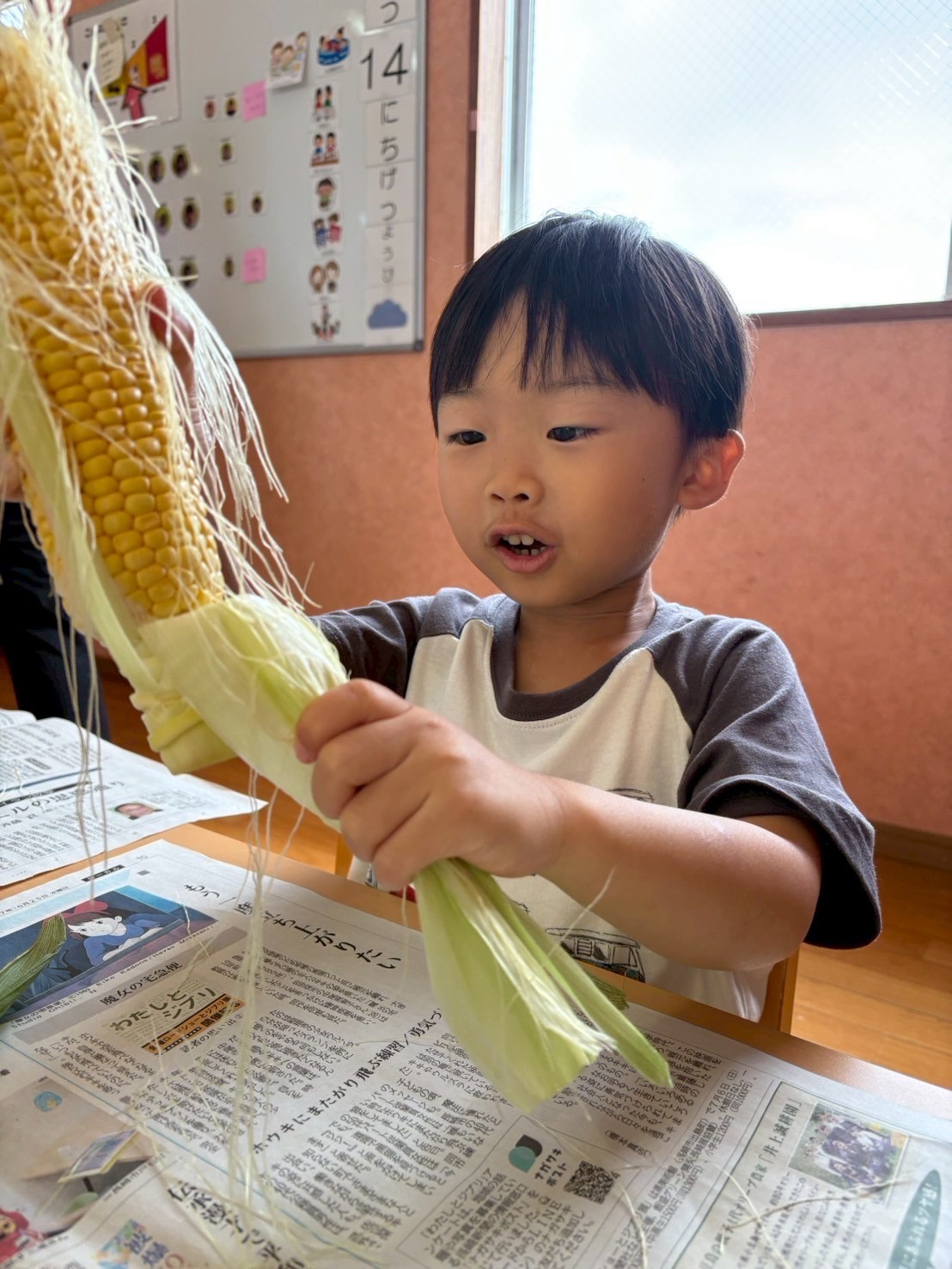食育の一環として、とうもろこしの皮むきをしました🌽