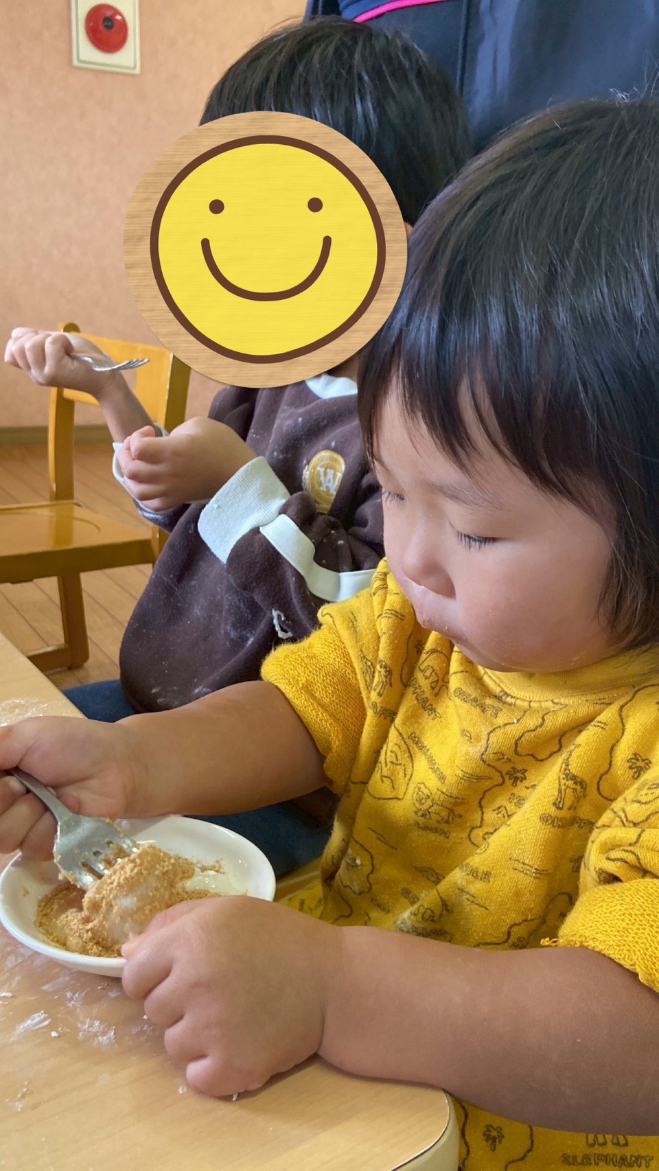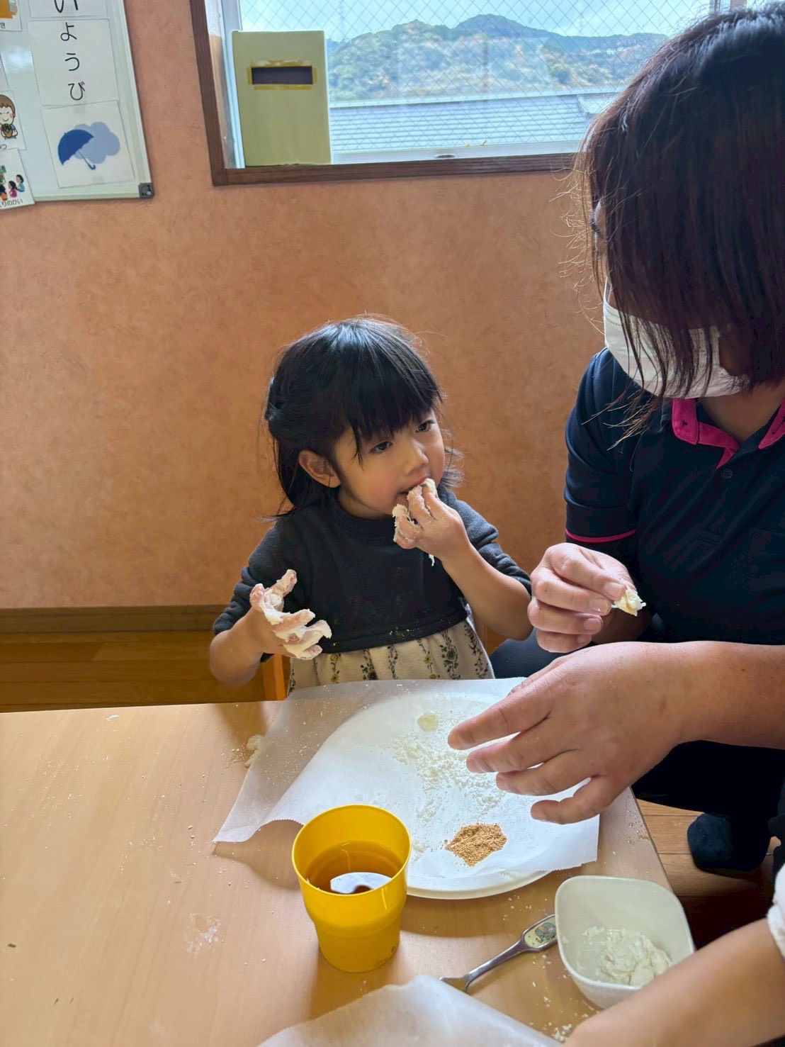 出来上がったお餅は、子どもたちが手にくっつけながら一口サイズに丸め、きなこをかけて美味しくいただきました✨