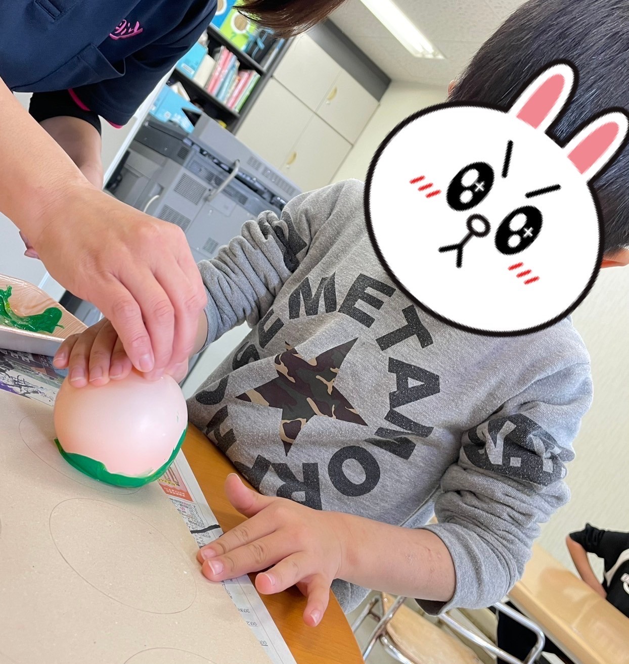 空き時間に壁面工作で【はらぺこあおむし】を作りました🐛風船に絵の具を付けてあおむしの体を作ってもらいました!