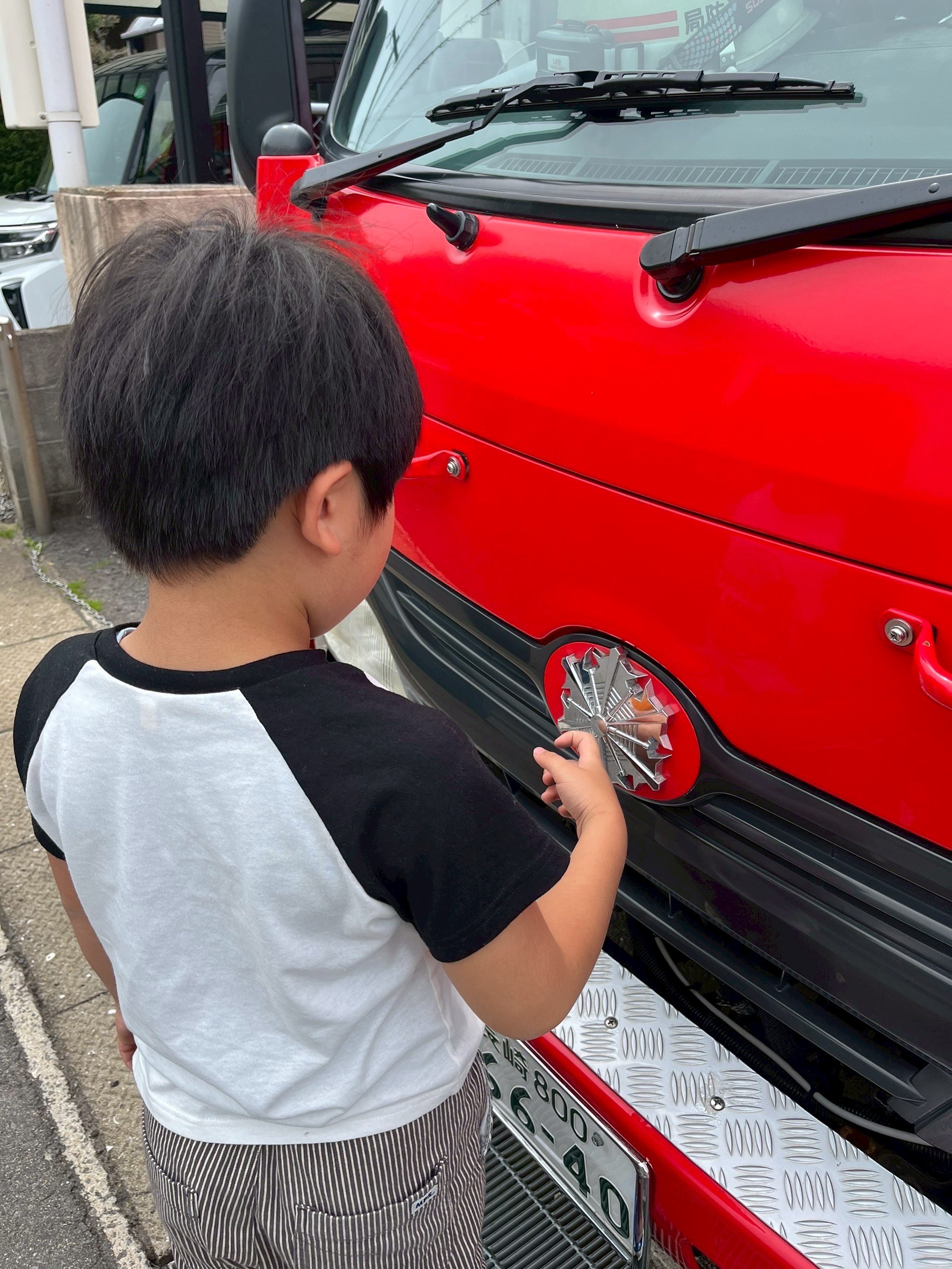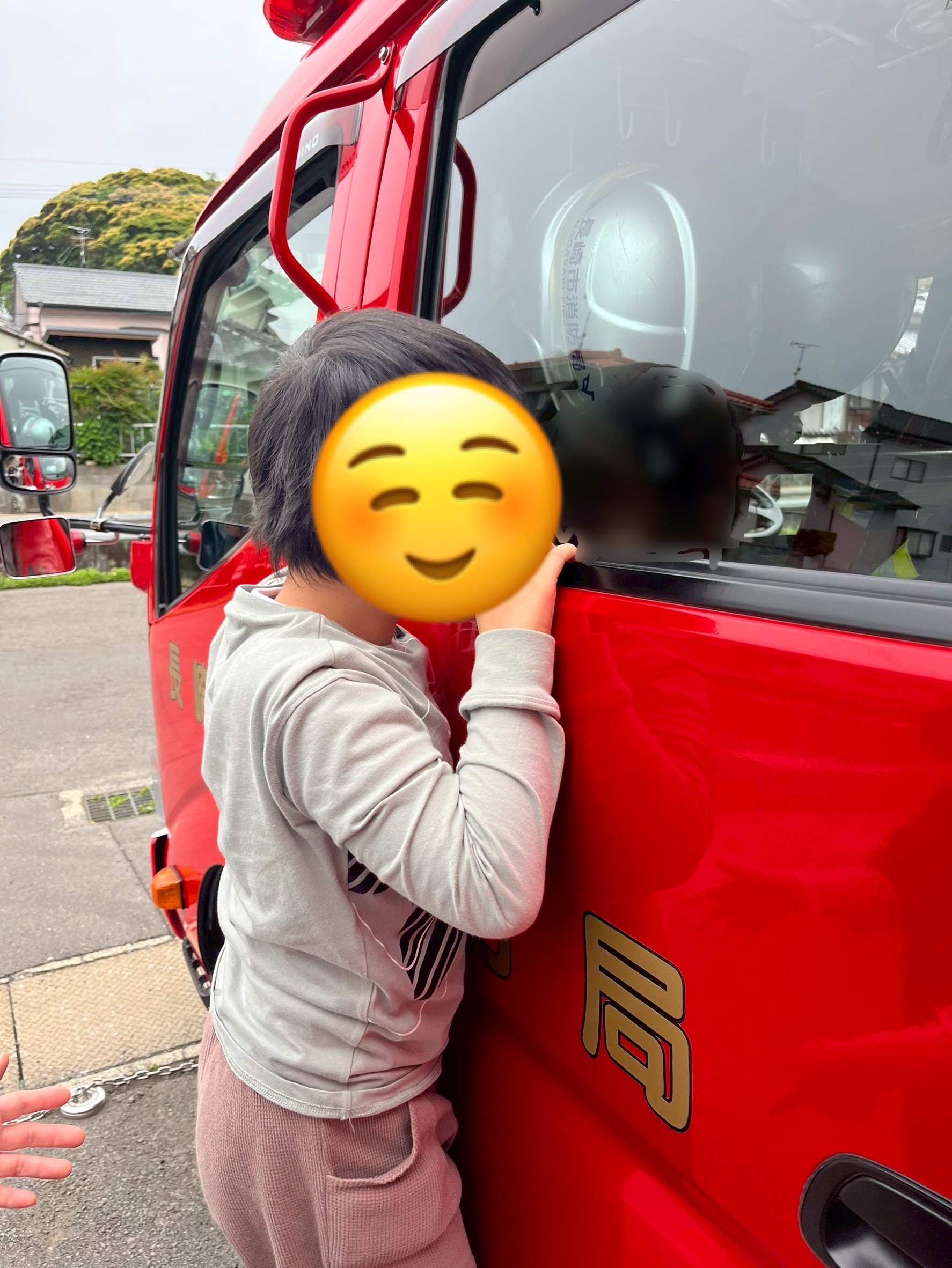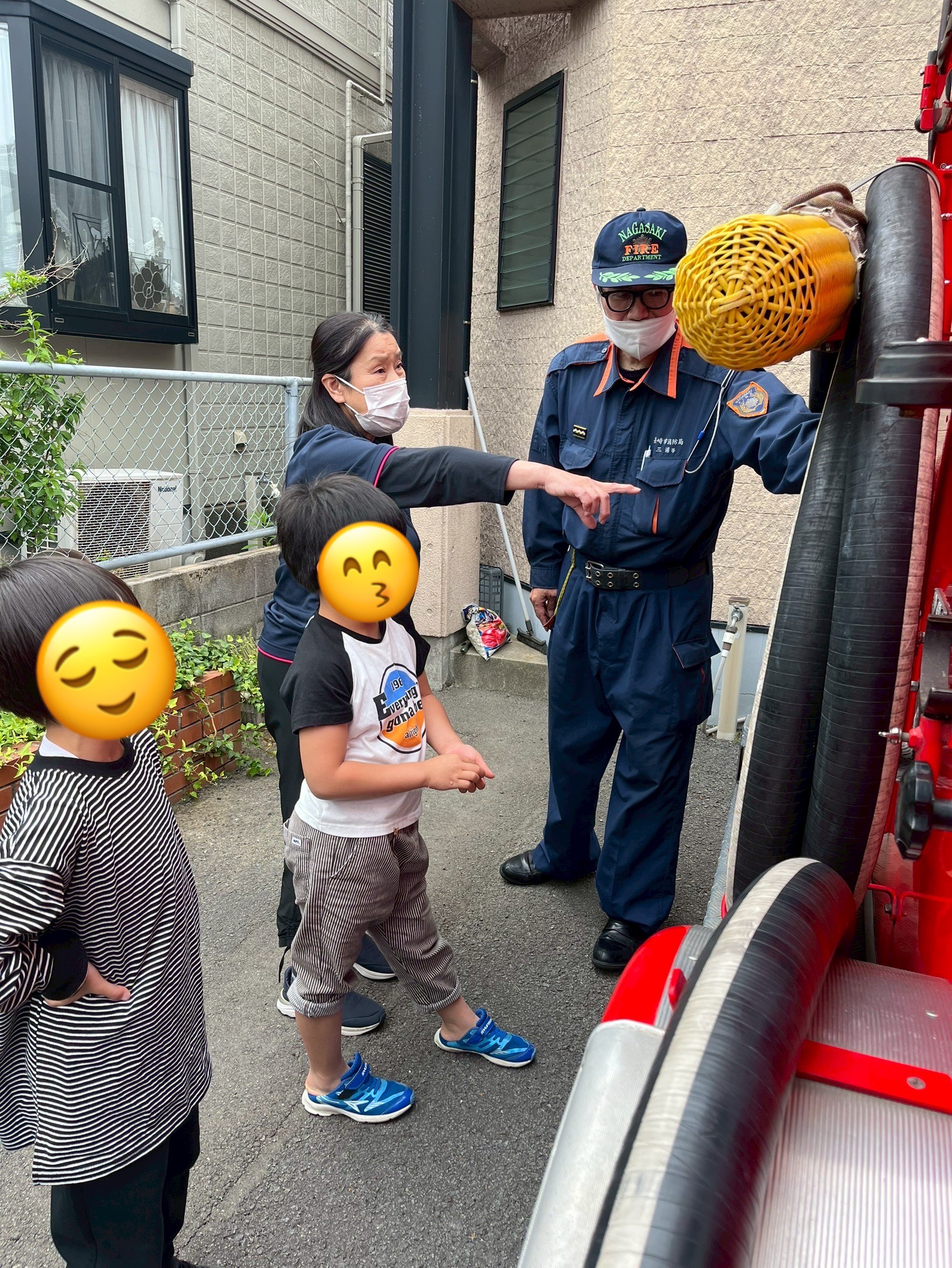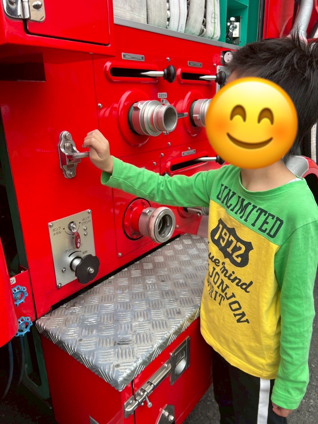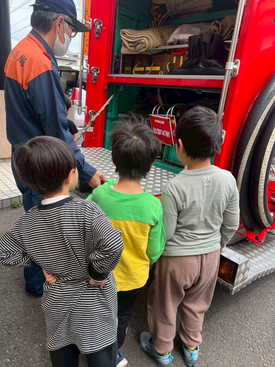 消火のやり方をお話ししてもらったり、実際に消防車に触れたりしました🚒✨放水用のロープを持ってみたり、消防車に備え付けてある機械を隅々まで見せてもらいました👀最後は一人ひとり消防車に乗せてもらい、大喜びの子ども達でした🤩
