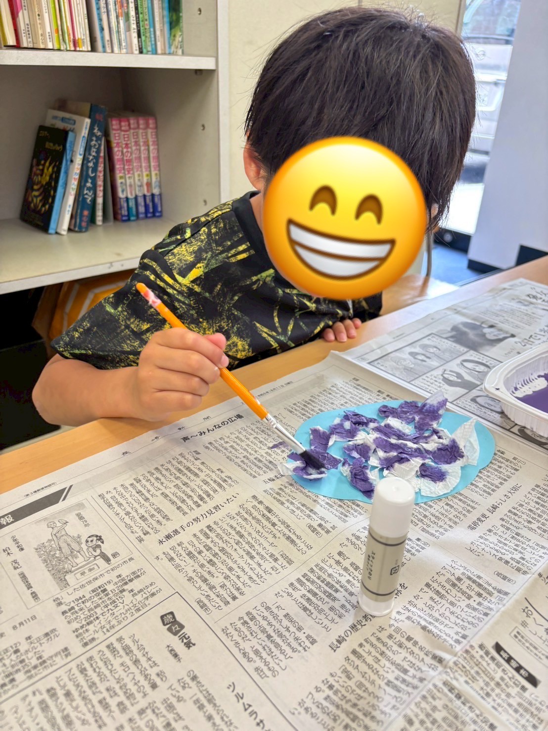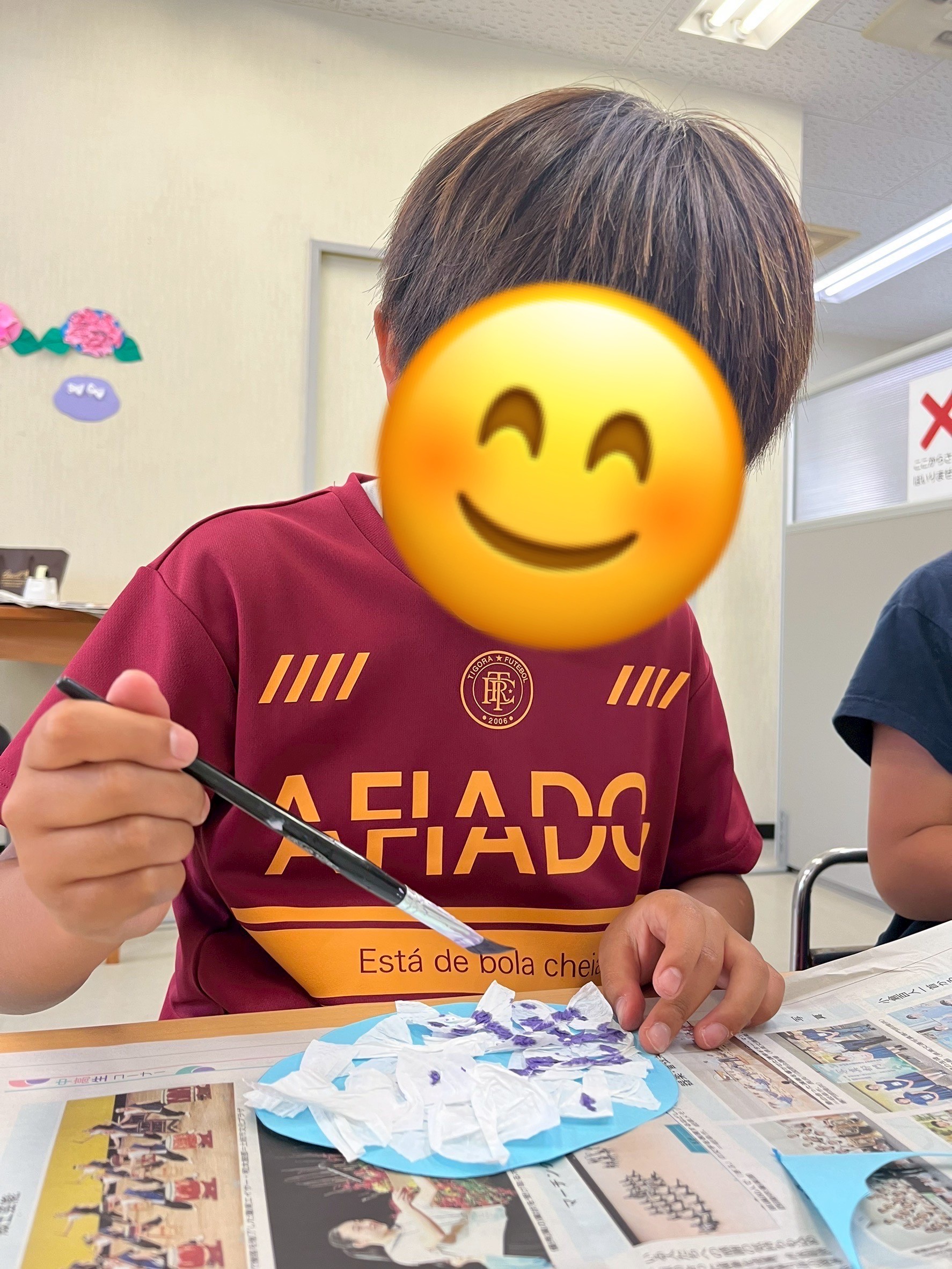 午後はあじさい工作をしました。折り紙で花びらを作ったりキッチンペーパーに絵の具をにじませて着色してもらいました。