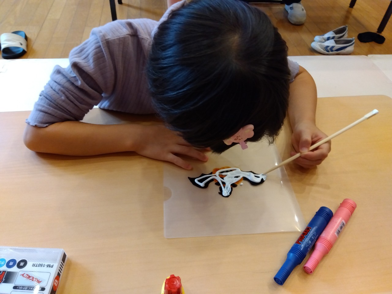 最後に、ボンドを塗る作業になると、ボンドの厚さを考えながら割り箸で伸ばすのは少しだけ苦戦していたように見えました💦