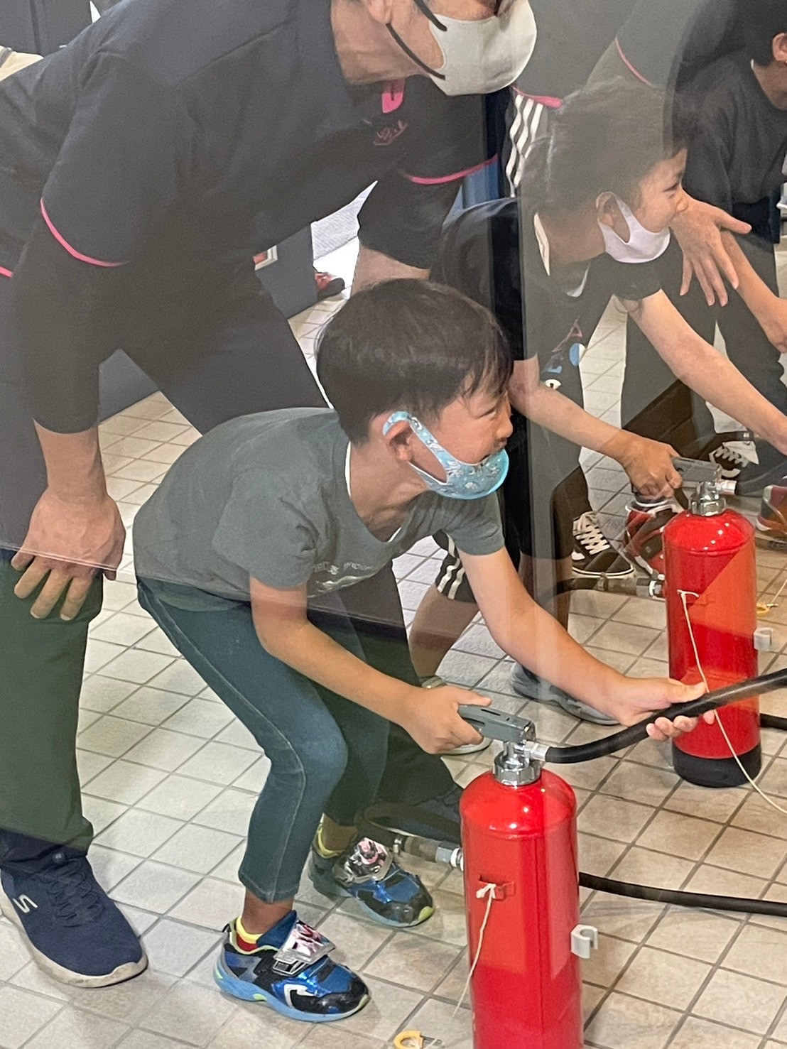 お昼からは防災体験広場で、①煙避難訓練②消火訓練③暴風体験の3つの体験をしました!