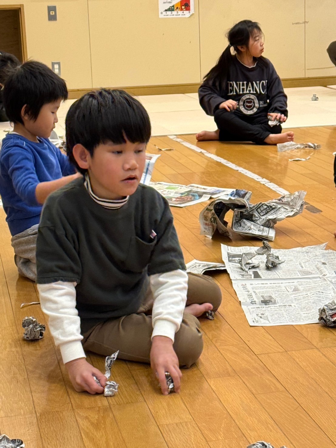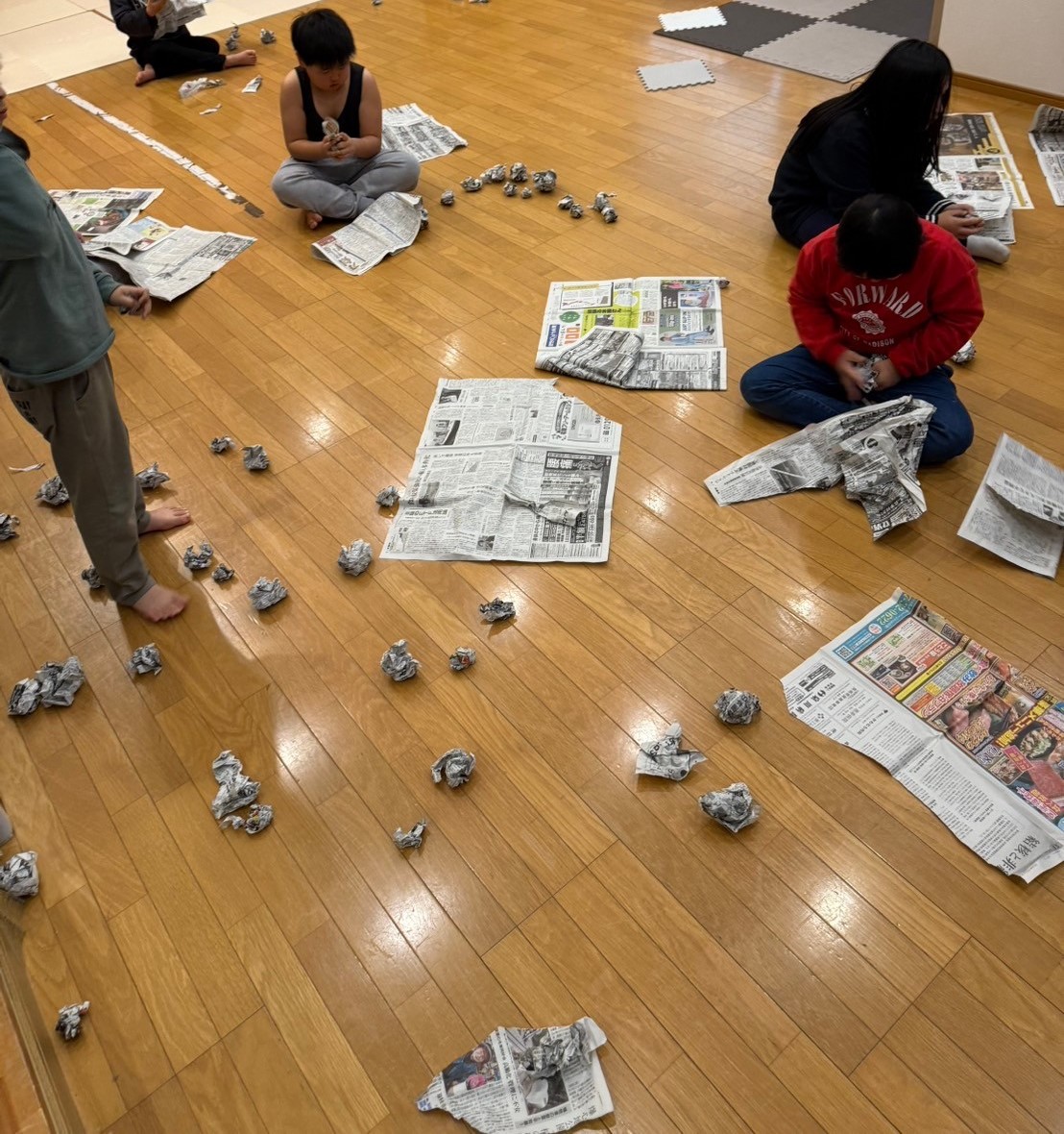 次は、新聞紙を使っての集団遊びでチームに分かれて新聞紙玉を投げ入れる遊びをしました!