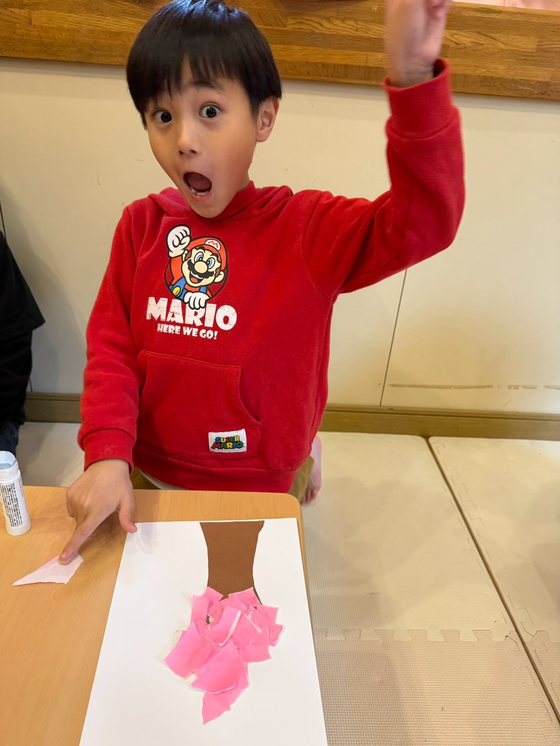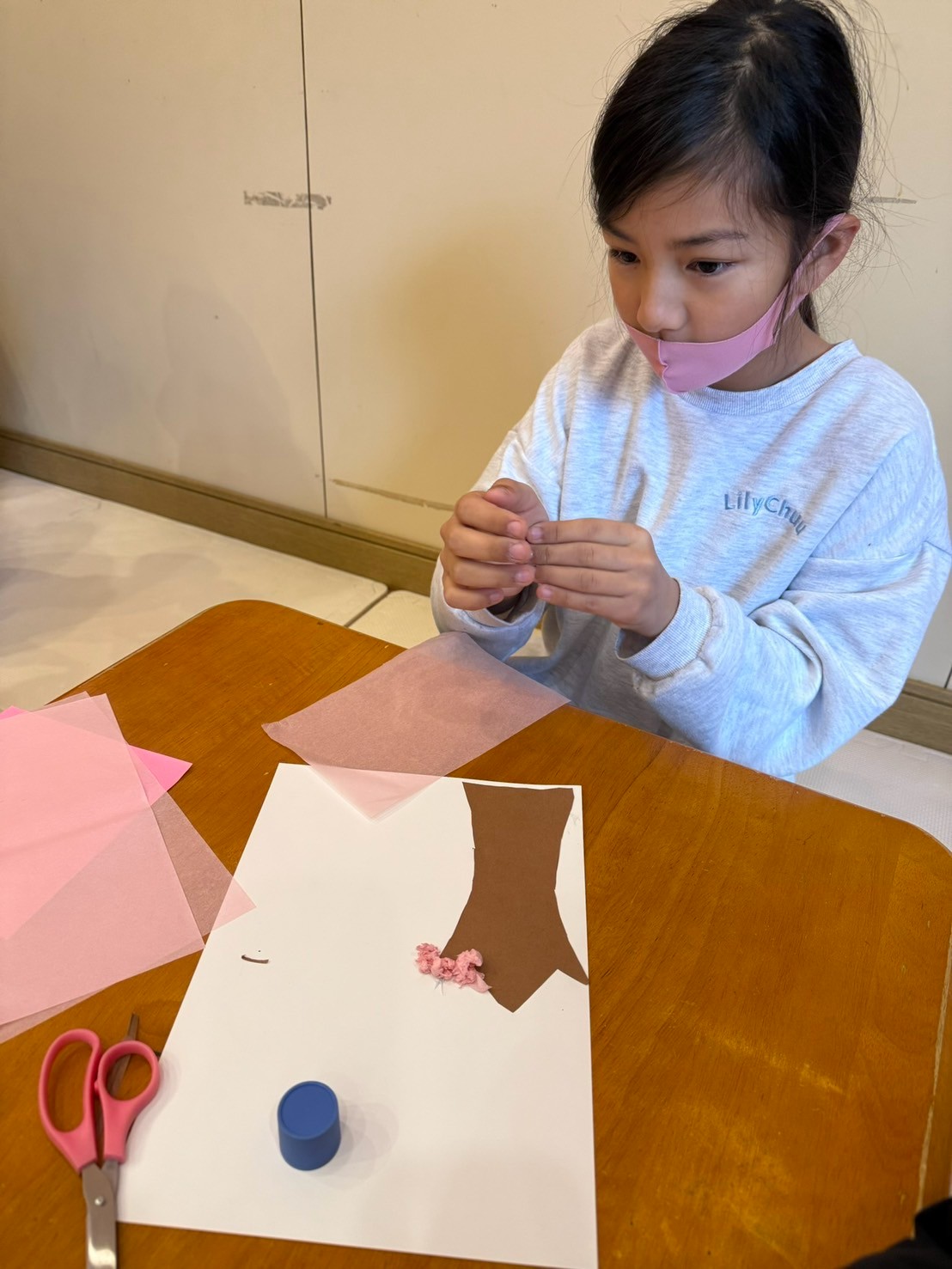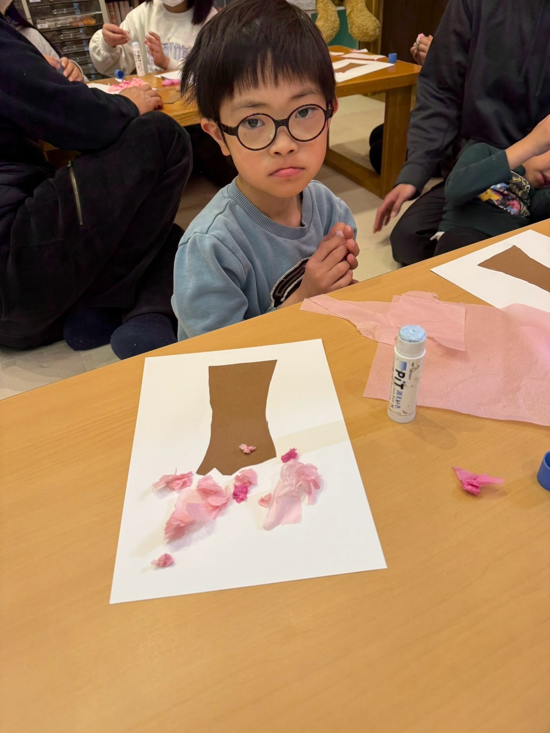 花紙は千切って丸めて貼り付け、折り紙はちぎり絵で自由に桜を表現しました🌸